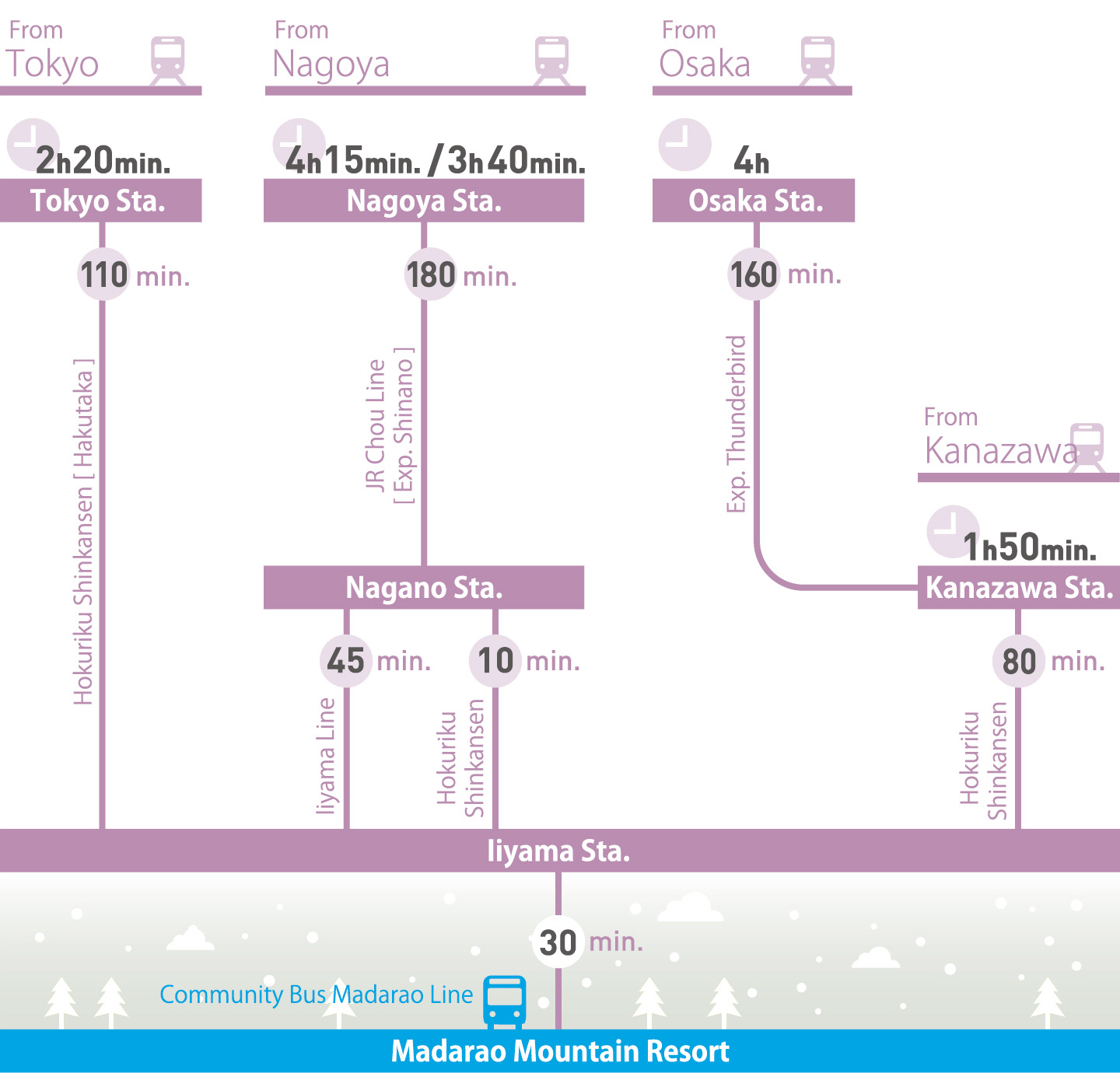 Getting to Madarao is now speedier than ever thanks to the opening of Iiyama Station. A 110-minute Bullet Train ride from Tokyo to Iiyama, and a 30 minute bus/car ride to Madarao, and you are ready to hit the slopes.